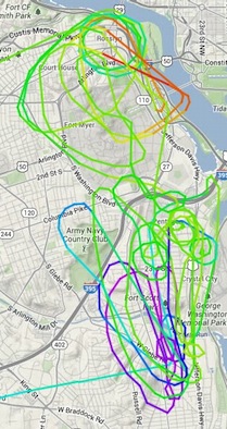 Most maneuvers were orbiting the locations at various distances and altitudes. The track shows our flight path that day. Some approach angles were shot with a chin mounted GoPro camera and with Alt Gobo’s Panasonic P2, operated by Peter Roof, was looking out the side door and using a crabbing maneuver. The side mount used the gyro-stabilized gimbal that is on a base that rotates. This low cost system makes for decent video at a fraction of the cost of heavy traditional systems.